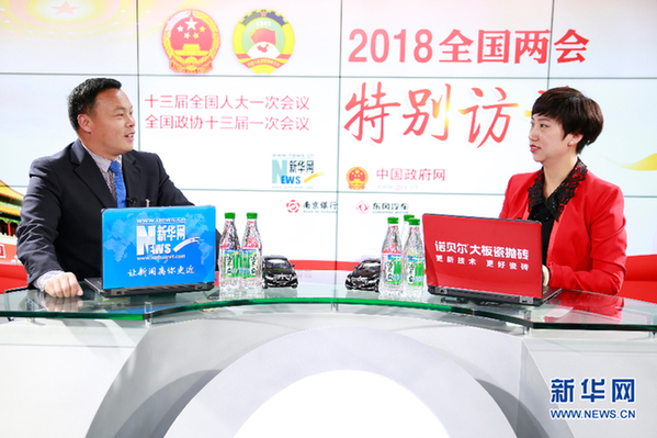 圖為全國人大代表、河南省平頂山市寶豐縣大黃村黨支部書記馬豹子做客新華網(wǎng)2018全國兩會(huì)特別訪談 新華網(wǎng) 范作言 攝