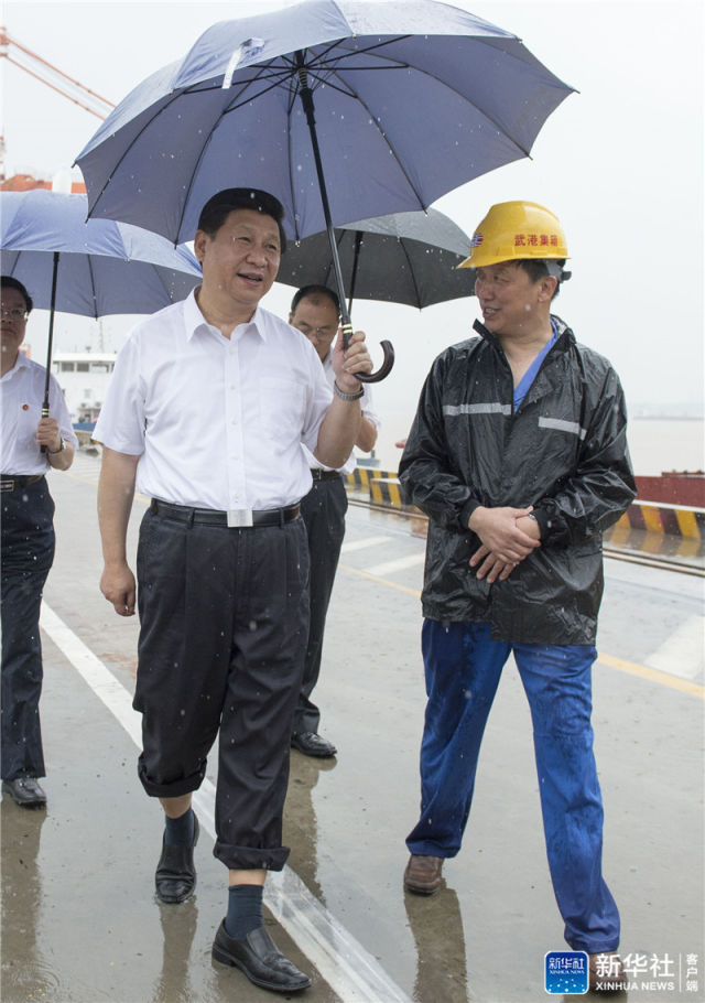 2013年7月21日上午,習近平冒雨來到武漢新港陽邏集裝箱港區考察。新華社記者 李學仁 攝