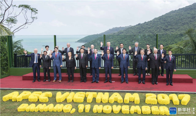 2017年11月11日,亞太經合組織第二十五次領導人非正式會議在越南峴港舉行。習近平出席并發表題為《攜手譜寫亞太合作共贏新篇章》的重要講話。這是會議期間,習近平同其他亞太經合組織成員經濟體領導人、代表合影。新華社記者 李濤 攝