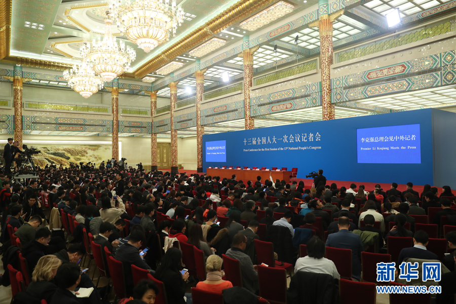 3月20日上午,十三屆全國人大一次會議閉幕后,國務院總理李克強在人民大會堂三樓金色大廳會見采訪十三屆全國人大一次會議的中外記者并回答記者提出的問題。圖為記者會現場。 新華網/中國政府網 翟子赫 攝