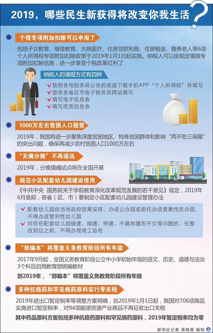 告別2018,迎來2019。新的一年,個稅改革紅利進一步釋放,更多貧困人口將實現脫貧,生娃、入托、上學、用藥等方方面面都將發生深刻變化。2019,哪些民生新獲得將改變你我生活?