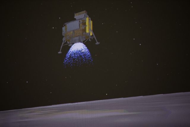 圖為1月3日在北京航天飛行控制中心拍攝的降落過程(示意圖)。1月3日10時26分,嫦娥四號探測器自主著陸在月球背面南極-艾特肯盆地內的馮·卡門撞擊坑內,實現人類探測器首次在月球背面軟著陸。新華社記者 金立旺 攝