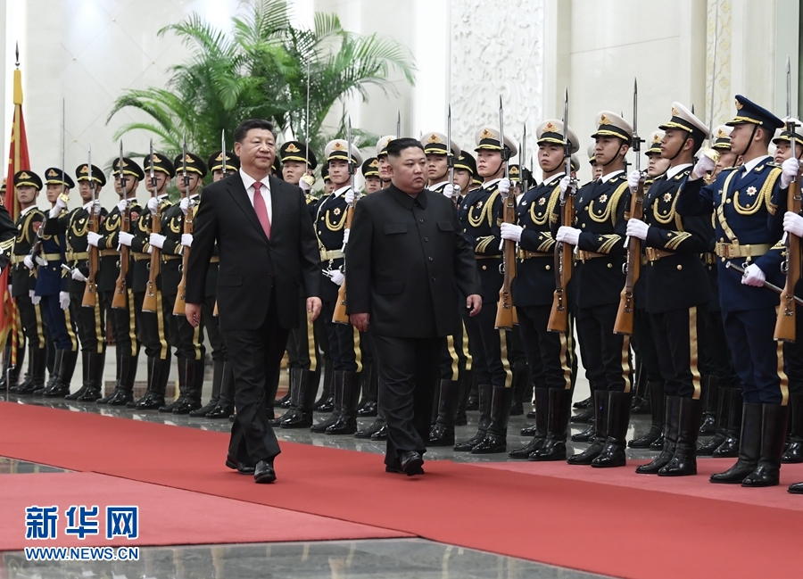 1月8日,中共中央總書記、國家主席習近平同當日抵京的朝鮮勞動黨委員長、國務委員會委員長金正恩舉行會談。會談前,習近平在人民大會堂北大廳為金正恩舉行歡迎儀式。 新華社記者 申宏 攝