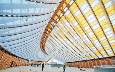 “我們要的是融入的效果,而不是突兀的表現。”北京世園會中國館設計團隊成員黎靚介紹,中國館的設計借助了傳統中國元素,整體上是一個如意造型。雖然建筑物的高度較低,但在傳統中國建筑的基礎上,加上了現代的流暢弧線,顯得動感十足;而且與周圍自然景觀相融,并不顯得張揚,突出了北京世園會的綠色、生態主題。