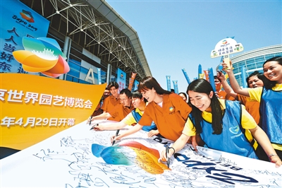 北京延慶區(qū)團(tuán)委組織志愿者在世園會(huì)誓師行動(dòng)旗幟上簽名(資料照片)。本報(bào)記者 賀勇攝