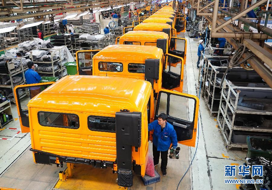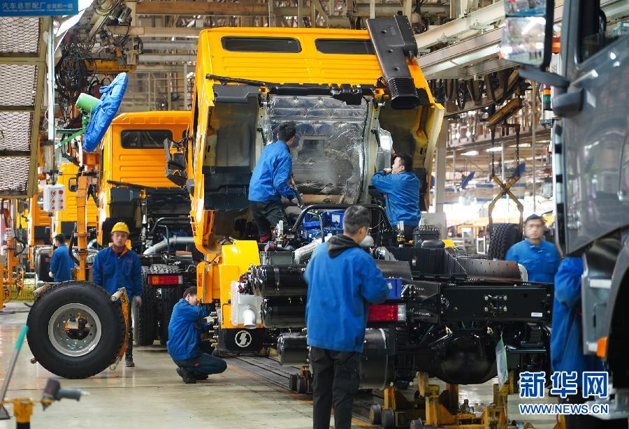 工人在陜汽集團下屬的陜重汽汽車總裝配廠車間流水線上作業(1月17日攝)。 新華社記者 邵瑞 攝