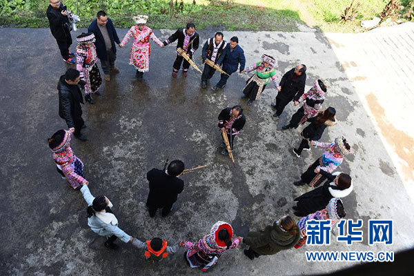 四川省敘永縣后山鎮三斗米村苗族村民與游客一起跳蘆笙舞(1月16日攝)。新華社記者 陳天湖 攝