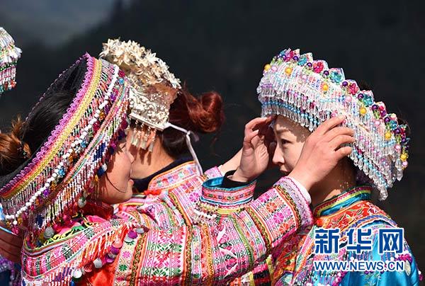 四川省敘永縣后山鎮三斗米村苗族婦女為游客(右)整理服飾(1月16日攝)。新華社記者 陳天湖 攝
