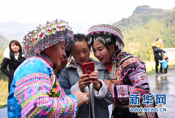 四川省敘永縣后山鎮三斗米村婦女在查看手機(1月16日攝)。新華社記者 謝佼 攝