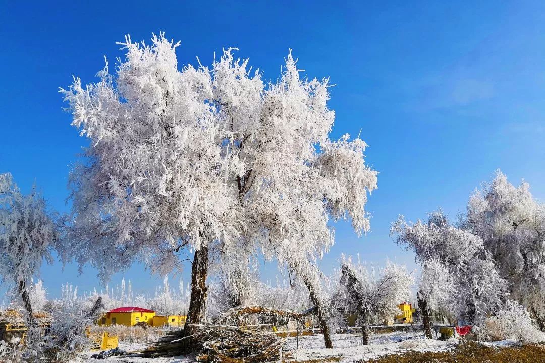 2019-1-27,新疆和田地區民豐縣安迪爾鄉。塔克拉瑪干沙漠中,胡楊身披雪白晶瑩的霧凇,小村莊安迪爾像童話般的存在!作者:左永江