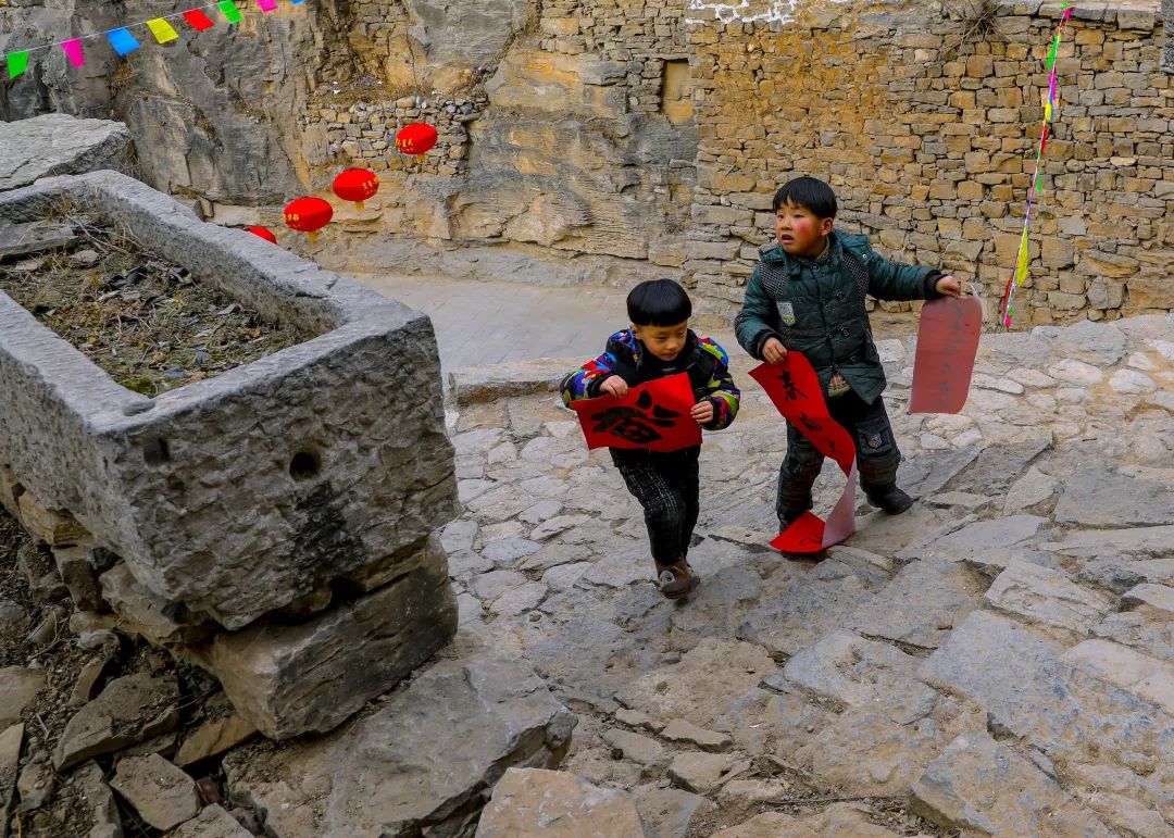 2019-01-29,河北省涉縣大洼村。新春到來(lái)之際,書畫大師下鄉(xiāng)進(jìn)山溝,揮毫潑墨送溫暖,倆村娃興致勃勃將福字春聯(lián)帶回家。作者:滄海