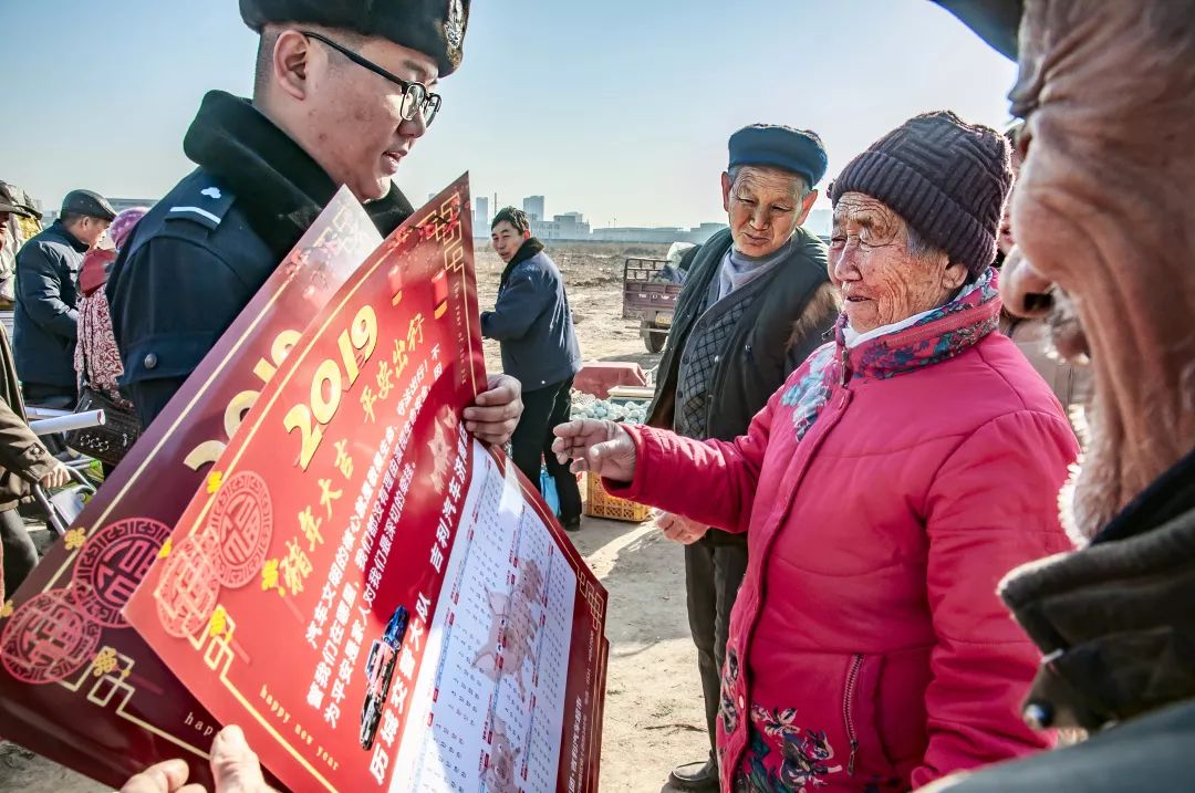 2019-02-01,山東省濟(jì)南市潘莊村。就在這家家戶戶都在忙年的時(shí)刻,交警來(lái)到集上為趕集人贈(zèng)送年歷,提醒人們節(jié)日期間注意交通安全。作者:程普麟