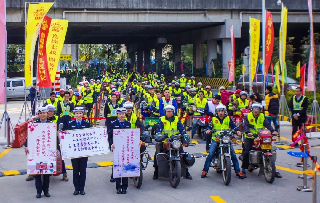 2019-01-21,廣東省佛山市。春運開始,摩托回鄉(xiāng)大軍在交警引導(dǎo)下有序前進(jìn),女警手提的告示牌上寫著“平安歸家見爸媽”。作者:獲得生命