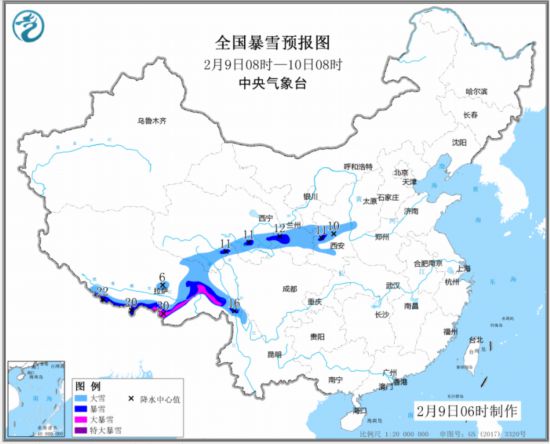 中央氣象臺2月9日06時繼續發布暴雪預報。預計,9日08時至10日08時,陜西中部、甘肅東部、青海東部和南部、西藏東部和南部、山西西南部等地的部分地區有大到暴雪,其中,西藏南部和東部的局部地區有大暴雪或特大暴雪(見圖1)。