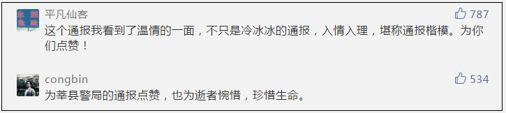 撰寫這份通報的莘縣公安局宣傳科室相關負責人稱,通報發布后,他們收獲了很多暖心留言。“其實我們這樣寫通報的原因很簡單,就是站在死者家屬的角度、立場去考慮這個事情?!?/p>