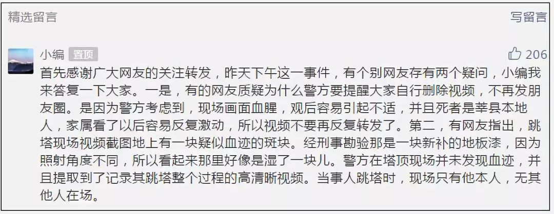 “我們就在通報的基礎上,通過留言進行了辟謠和提醒?!本奖硎?,就此事有個別網友存有兩個疑問:一是,質疑為什么警方要提醒大家自行刪除視頻。警方解釋,現場畫面血腥,觀后容易引起不適,并且死者是莘縣本地人,家屬看了以后容易反復激動。二是,網友指出,跳塔現場視頻截圖地上有一塊疑似血跡的斑塊。經刑事勘驗那是一塊新補的地板漆,因照射角度不同,所以看起來那里好像是濕了一塊兒。警方在現場并未發現血跡,此外,當事人跳塔時,現場只有他本人。