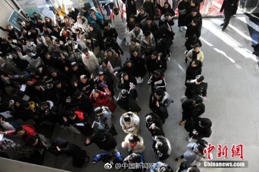 2月13日,北京東棉花胡同里,考生排隊等待參加中央戲劇學院招生專業考試。逾6.7萬人次報考,為歷年最高。
