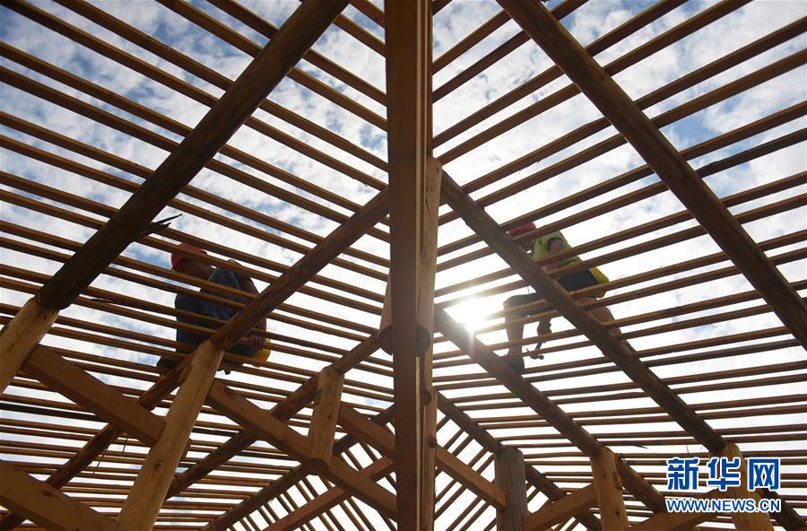 在湖北省宣恩縣曉關侗族鄉,工人在建設吊腳樓(2018年7月26日攝)。2018年,當地政府開始修建6座新的侗寨吊腳樓,為符合易地搬遷政策的貧困戶實施搬遷。新華社發(王俊 攝)