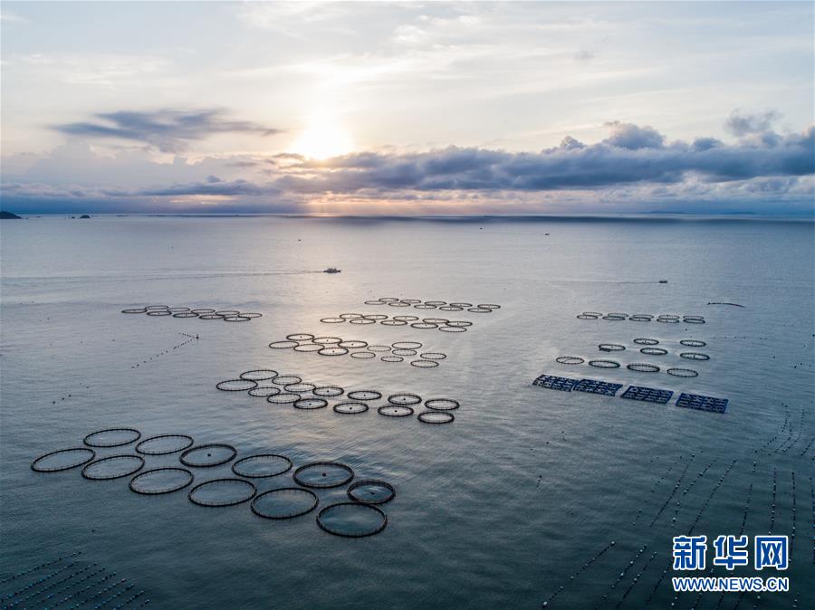 夕陽映照下的浙江省溫州市平陽縣南麂島馬祖岙海域,圓形的都是大黃魚養殖網箱(2018年8月18日無人機拍攝)。新華社記者 徐昱 攝