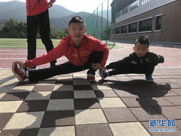 圖為李想(左)與弟弟一起做拉伸。(李想的母親楊建英提供的資料照片) 新華社發