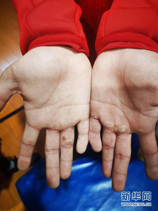 圖為李想展示手上的老繭。(李想的母親楊建英提供的資料照片) 新華社發