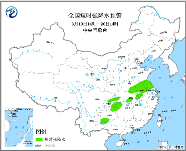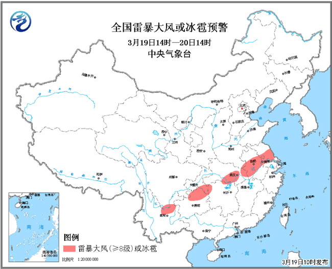 這次降雨過(guò)程中,會(huì)有明顯的雷電天氣。從19日夜間開(kāi)始,河南南部、江蘇、安徽東北部、湖北北部、湖南西北部和貴州北部等地將先后出現(xiàn)雷電、短時(shí)強(qiáng)降水、雷暴大風(fēng)和冰雹等強(qiáng)對(duì)流天氣。19日10時(shí),中央氣象臺(tái)發(fā)布了強(qiáng)對(duì)流天氣藍(lán)色預(yù)警。