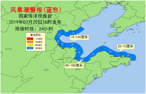 受冷空氣和出海氣旋的共同影響,預計:3月20日傍晚到21日中午,渤海灣將出現70到140厘米的風暴增水,萊州灣將出現80到180厘米的風暴增水,山東半島北部沿海將出現30到70厘米的風暴增水。上述岸段內的天津塘沽、河北曹妃甸、黃驊和山東濱州港潮位站將于21日凌晨出現達到當地藍色警戒潮位的高潮位。天津市、河北省唐山市、滄州市和山東省濱州市的風暴潮預警級別為藍色。