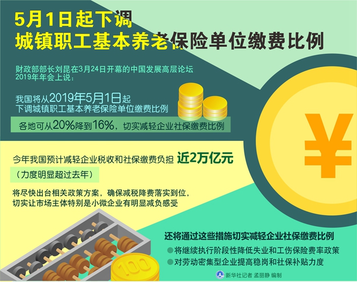 新華社北京3月24日電(記者韓潔、馬卓言)財政部部長劉昆在24日開幕的中國發展高層論壇2019年年會上說,我國將從2019年5月1日起下調城鎮職工基本養老保險單位繳費比例,各地可從20%降到16%,切實減輕企業社保繳費比例。