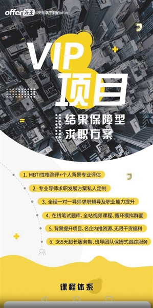 “該計劃分為6周,前4周時間內(nèi),由主講導(dǎo)師給大家講解這個項目的課題內(nèi)容及安排。后2周以實戰(zhàn)課專注項目報告的整合和產(chǎn)出為主,主要是整理產(chǎn)出報告的時間。最后也會有導(dǎo)師來教授如何包裝本段經(jīng)歷到簡歷上以及如何面試?!睋?jù)其介紹,參與該計劃,即可獲得長達一年時間的服務(wù)周期,除了提供求職信息、輔導(dǎo),還可以優(yōu)先獲得內(nèi)推機會,在簽訂合同時,將會由offer先生與求職者簽訂合同,列出求職企業(yè)名單,該名單將包含“第一志愿”梯隊與“第二志愿”梯隊,offer先生將負責(zé)保證求職者在服務(wù)期限內(nèi)獲得offer。