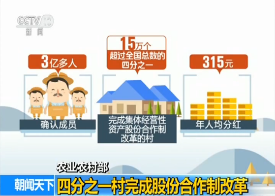 最新數據顯示,目前,全國農村集體經濟組織年收入達到4627億元,年經營收益超過5萬元的村接近30%。其中,完成集體經營性資產股份合作制改革的村有15萬個,超過全國總數的四分之一,確認成員有3億多人,年人均分紅315元。