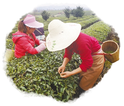 正值初春,茶海一股股綠色波浪間,采摘明前茶的身影漸漸多起來。走近些,只見茶農兩手并用,上下翻騰,大拇指和食指準確地將茶青捏住,用力一提,手腕一甩,鮮嫩的芽便收入了斜挎背的竹簍里。切不可用指甲掐,否則破壞了細胞結構,茶青是要變黑的。