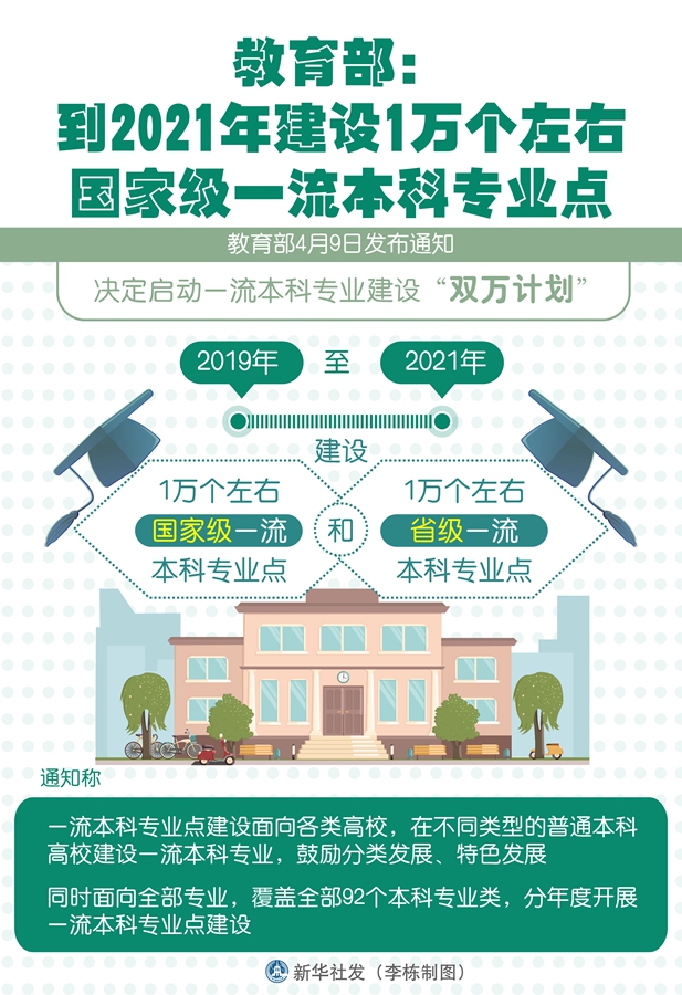 新華社北京4月9日電(記者施雨岑)教育部9日發布通知,決定啟動一流本科專業建設“雙萬計劃”,2019年至2021年建設1萬個左右國家級一流本科專業點和1萬個左右省級一流本科專業點。