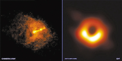 左圖 錢德拉X射線望遠鏡與事件視界望遠鏡同時拍攝的照片,顯示了M87星系中心黑洞的“相對論性噴流”。右圖 事件視界望遠鏡拍攝的M87星系中心黑洞圖像。圖片來源:美國趣味科學網(wǎng)站