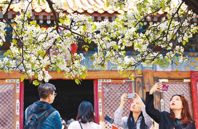 春日里,游客在故宮的梨花樹下拍照。祝振強攝