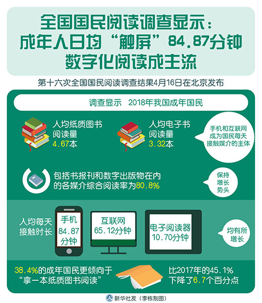 新華社北京4月16日電(記者 史競男)第十六次全國國民閱讀調(diào)查結(jié)果16日在京發(fā)布。調(diào)查顯示,2018年我國成年國民人均紙質(zhì)圖書閱讀量為4.67本、電子書閱讀量為3.32本,手機和互聯(lián)網(wǎng)成為國民每天接觸媒介的主體,紙質(zhì)書報刊的閱讀時長均有所減少。