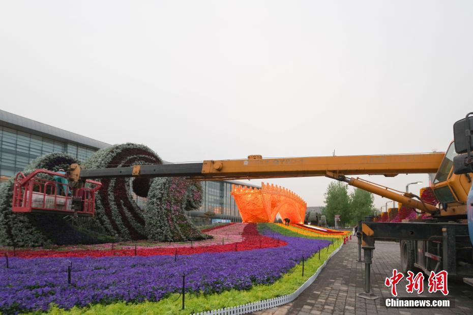 4月18日晚,北京奧林匹克公園內的“絲路金橋”主題景觀點亮燈光,附屬的花壇景觀正在緊張施工。“絲路金橋”由中國藝術家舒勇創作,長28米、高6米、寬4米,是以“一帶一路”倡議為語境的大型藝術作品,此次作為第二屆“一帶一路”國際合作高峰論壇的主題花壇亮相。中新社記者 賈天勇 攝