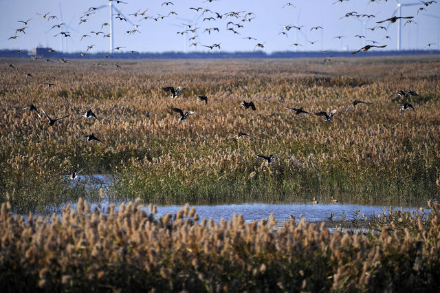 這組照片拍攝于上海著名的崇明東灘濕地,當時正值初冬時節。曲水彎環的蘆葦叢中,成群結隊的越冬候鳥時而悠閑覓食,時而群鳥歡飛,譜寫了一曲美妙的自然樂章。