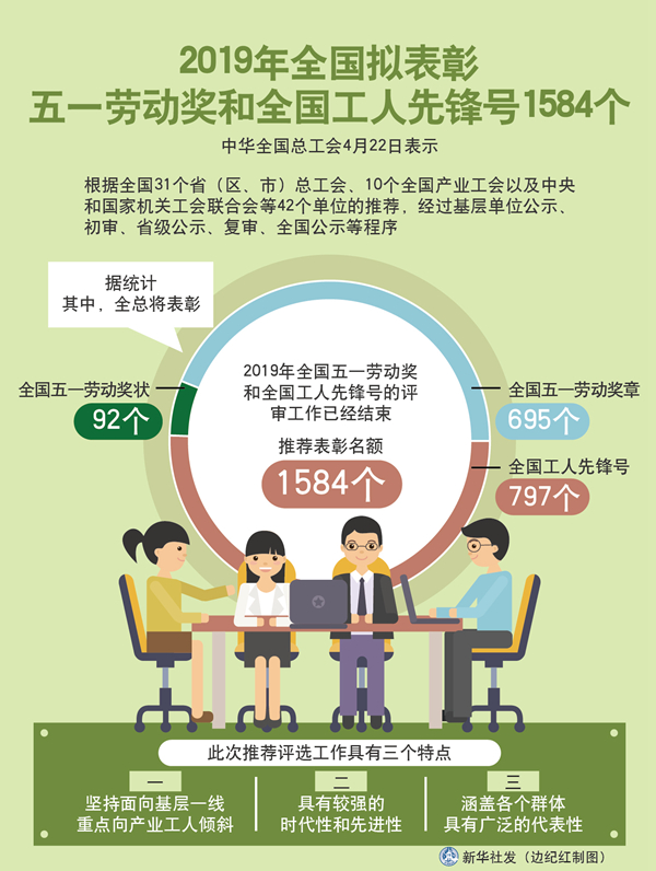新華社北京4月22日電(記者樊曦)中華全國總工會22日表示,根據(jù)全國31個省(區(qū)、市)總工會、10個全國產(chǎn)業(yè)工會以及中央和國家機關(guān)工會聯(lián)合會等42個單位的推薦,經(jīng)過基層單位公示、初審、省級公示、復(fù)審、全國公示等程序,2019年全國五一勞動獎和全國工人先鋒號的評審工作已經(jīng)結(jié)束,推薦表彰名額1584個。