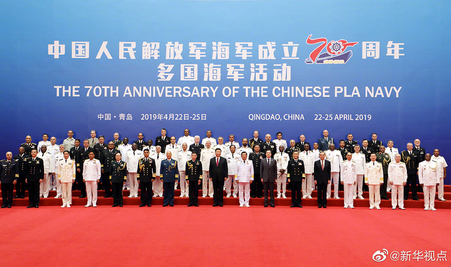 習近平同應(yīng)邀前來參加中國人民解放軍海軍成立70周年多國海軍活動的外方代表團團長集體合影留念