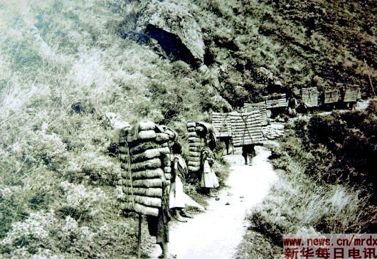 這是1903年法國人方蘇雅拍攝的四川背夫從瀘定背茶到康定的照片。新華社資料片