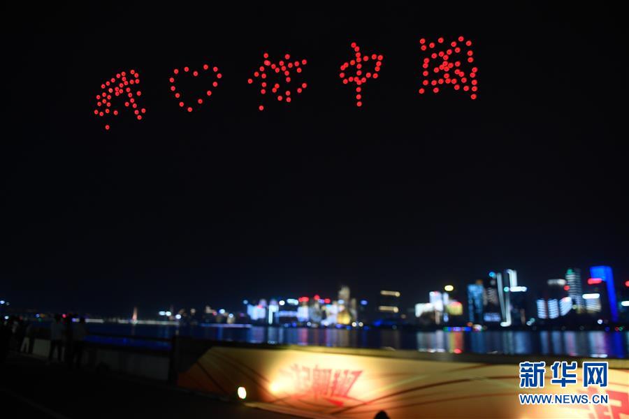 5月20日,約150架無人機(jī)空中編隊(duì)在錢塘江上空組成“我愛你中國”字樣。 當(dāng)晚,在浙江杭州錢塘江畔,城市燈光秀和約150架無人機(jī)組成的空中編隊(duì)表演交相輝映。“520中國”“我愛你中國”“70年”……對祖國進(jìn)行的一場“深情告白”閃耀錢塘兩岸。 新華社記者黃宗治攝