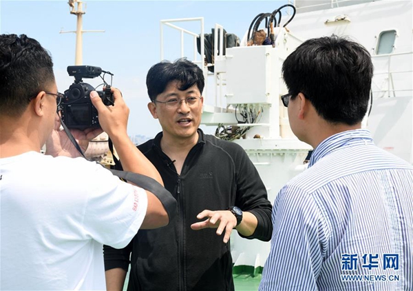 5月18日,航次首席科學(xué)家、中國科學(xué)院海洋研究所研究員徐奎棟(中)在接受采訪。新華社記者 李紫恒 攝