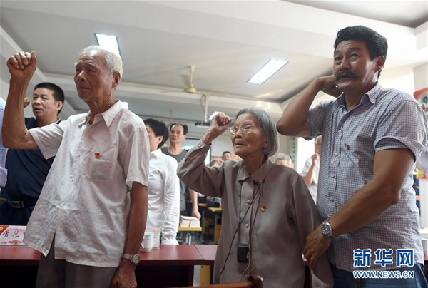 7月1日,呂銀芬(前中)等黨員在“七一”主題黨日活動中重溫入黨誓詞。新華社記者 韓傳號 攝