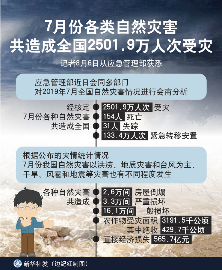 新華社北京8月6日電(記者葉昊鳴)記者6日從應急管理部獲悉,應急管理部近日會同多部門對2019年7月全國自然災害情況進行會商分析。經核定,7月份各種自然災害共造成全國2501.9萬人次受災,154人死亡,31人失蹤,133.4萬人次緊急轉移安置。