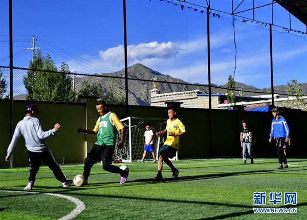 孩子們在山南市澤當(dāng)鎮(zhèn)贊堂社區(qū)操場踢足球(7月31日攝)。新華社記者 張汝鋒 攝