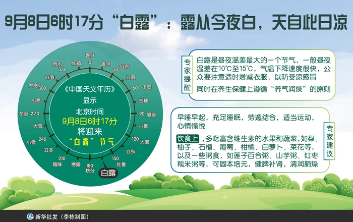 新華社天津9月6日電(記者周潤(rùn)健)“憑闌久,金波漸轉(zhuǎn),白露點(diǎn)蒼苔。”《中國(guó)天文年歷》顯示,北京時(shí)間9月8日6時(shí)17分將迎來(lái)“白露”節(jié)氣。專家提醒說(shuō),此時(shí)節(jié)“秋老虎”將逝去,氣溫開(kāi)始下降,天氣逐漸轉(zhuǎn)涼,公眾要注意養(yǎng)氣潤(rùn)燥。