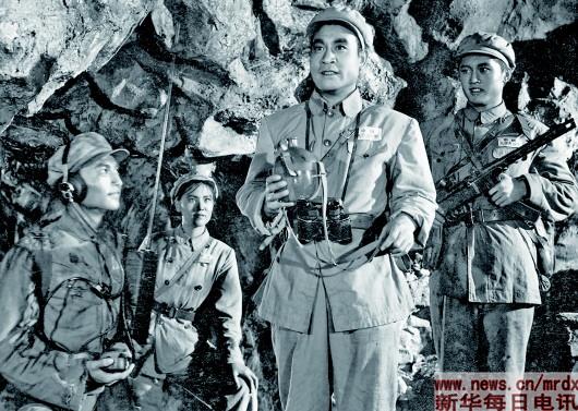 國產故事片《上甘嶺》鏡頭之一:堅守在上甘嶺的英雄們——張連長(右二)、通訊員楊德才(右一)、衛生員王蘭(左二)。新華社發