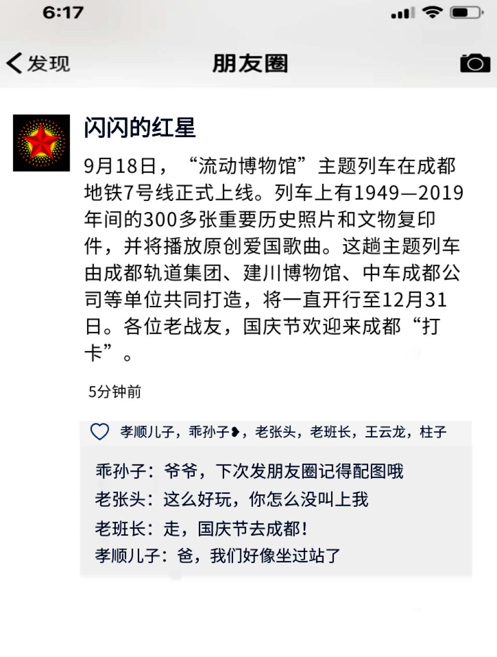 我: 爺爺,手機上有朋友圈,可以看到你的戰友們的動態