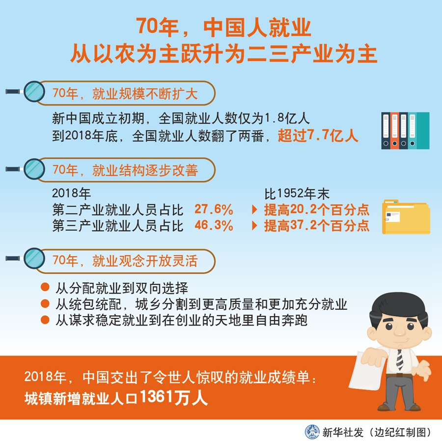 新華社北京9月24日電(記者葉昊鳴)從新中國成立之初大多數勞動者以農為主,到2018年第二、三產業就業人員占比超七成,服務業占主導的現代就業模式逐步形成,并日漸成為推動我國經濟社會發展的重要力量。
