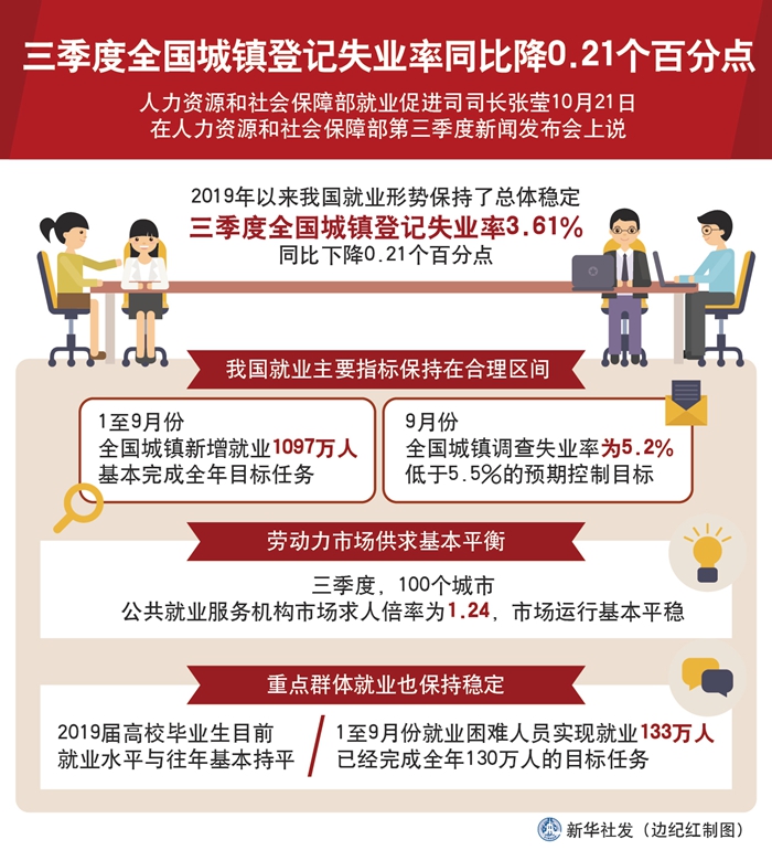 新華社北京10月21日電(記者王優玲)人力資源和社會保障部就業促進司司長張瑩21日說,今年以來我國就業形勢保持了總體穩定,三季度全國城鎮登記失業率3.61%,同比下降0.21個百分點。